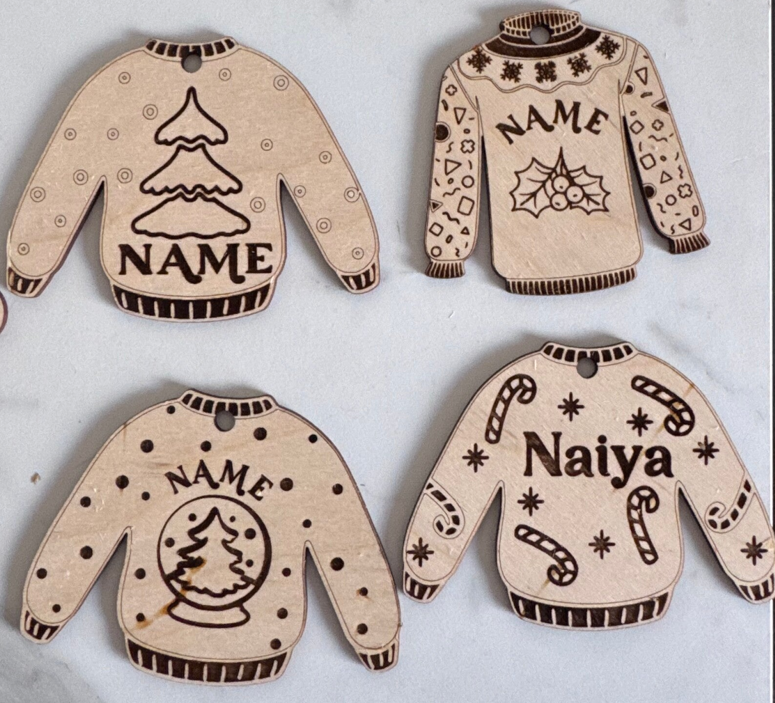 Get ready to deck the halls with some ugly sweater cheer! These adorable laser-cut and engraved ornaments are made from high-quality Baltic Birch wood, bringing the cozy charm of a handmade holiday classic to your tree.